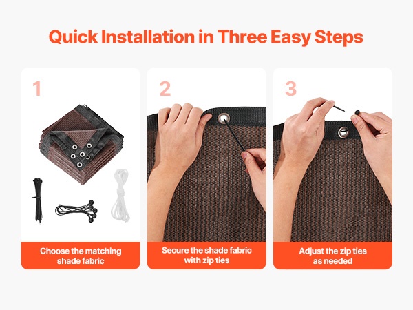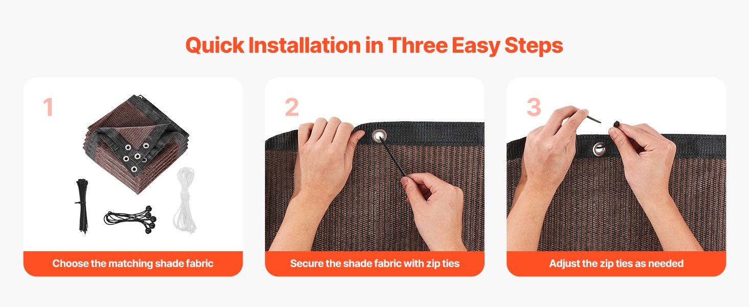 Pakkaukseen sisältyy 30 mustaa nippusidettä, 5 joustopalloa ja 4 nailonköyttä, joiden avulla varjokankaan saa kiinnitettyä nopeasti muutamassa yksinkertaisessa vaiheessa. Voit valita kiinnitystavan oman rakenteesi ja tarpeidesi mukaan.