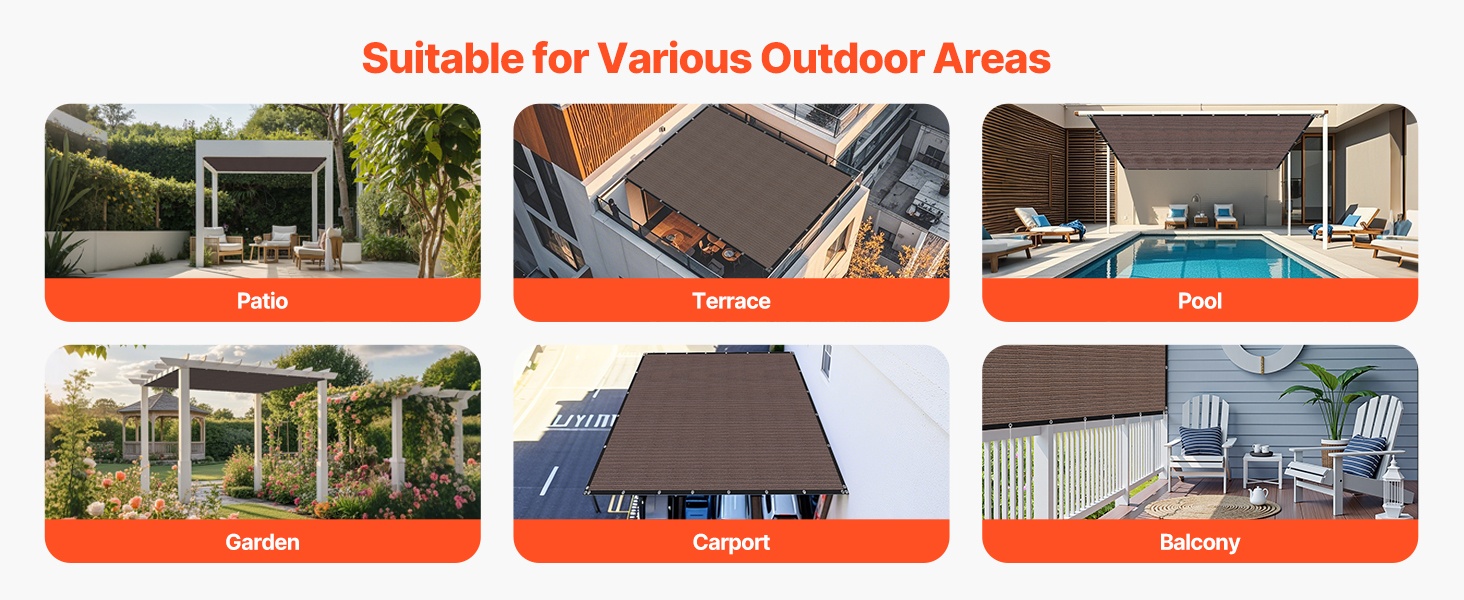 Varjokangas sopii useisiin ulkokohteisiin, kuten terasseille, pergoloihin, parvekkeille, puutarhoihin, uima-altaan ympärille ja autokatoksiin. Se auttaa parantamaan ulkotilojen käyttömukavuutta ja suojaa samalla auringolta.