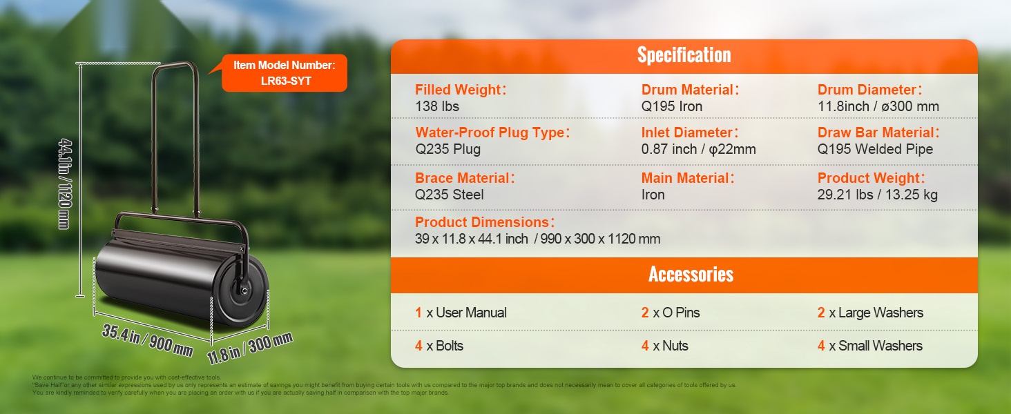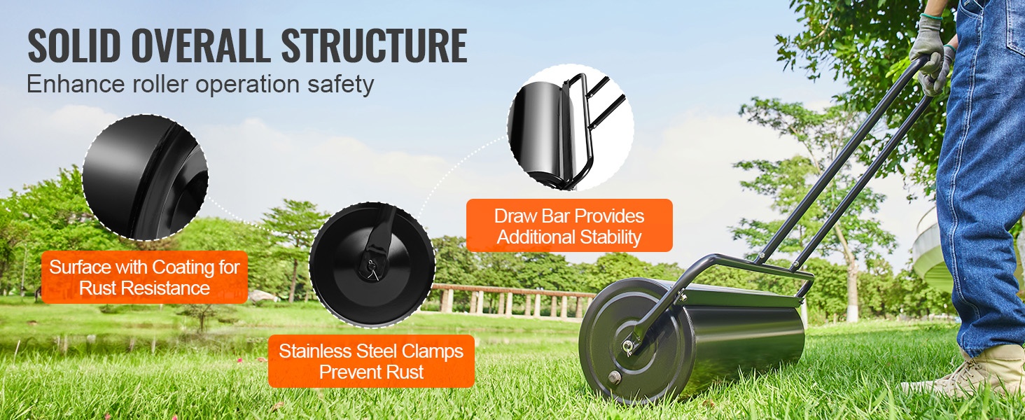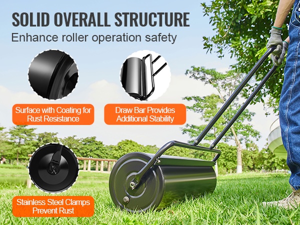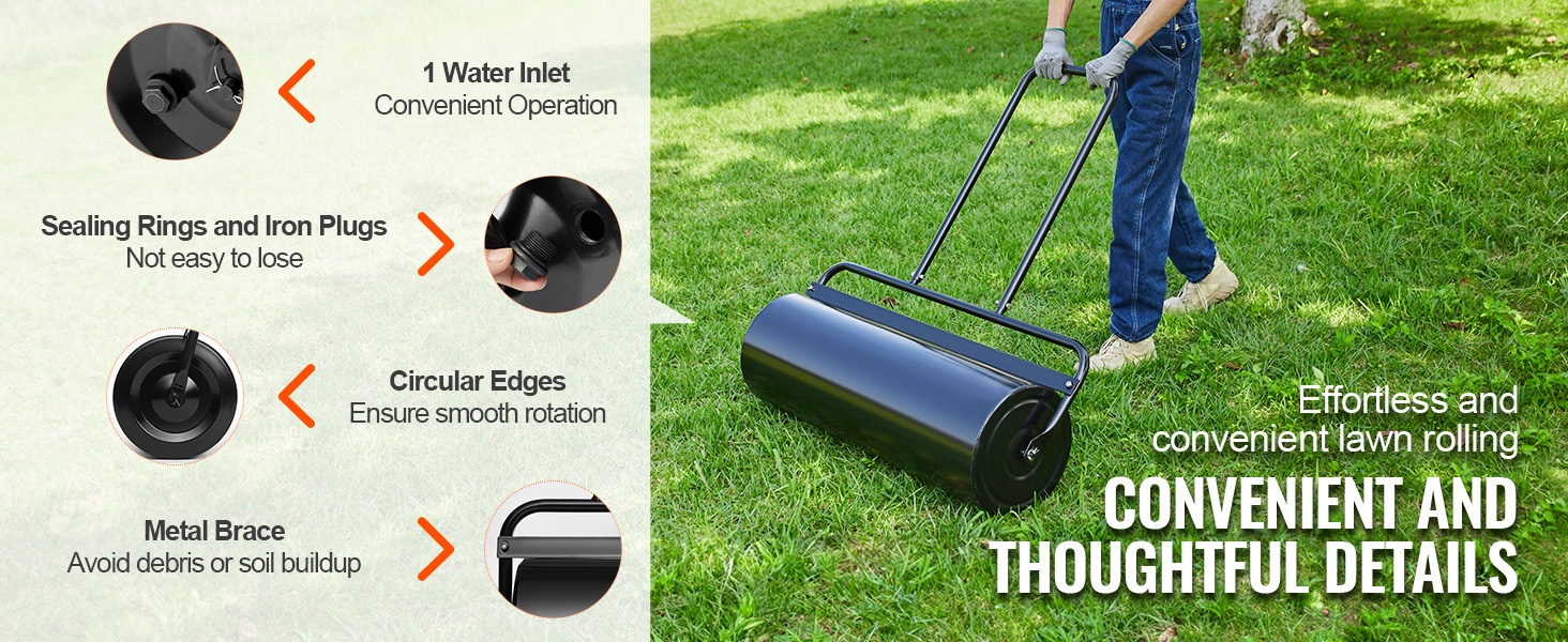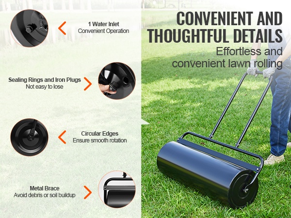 Nurmijyrässä on 2 vesitäyttöaukkoa, tiivisterenkaat, rautatulpat, pyöristetyt reunat ja metallinen tukirakenne. Nämä yksityiskohdat parantavat käytettävyyttä, turvallisuutta ja helpottavat käyttöä sekä auttavat suojaamaan nurmikkoa.