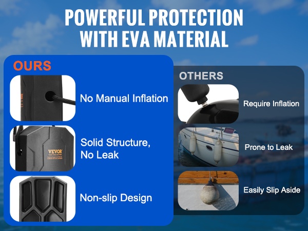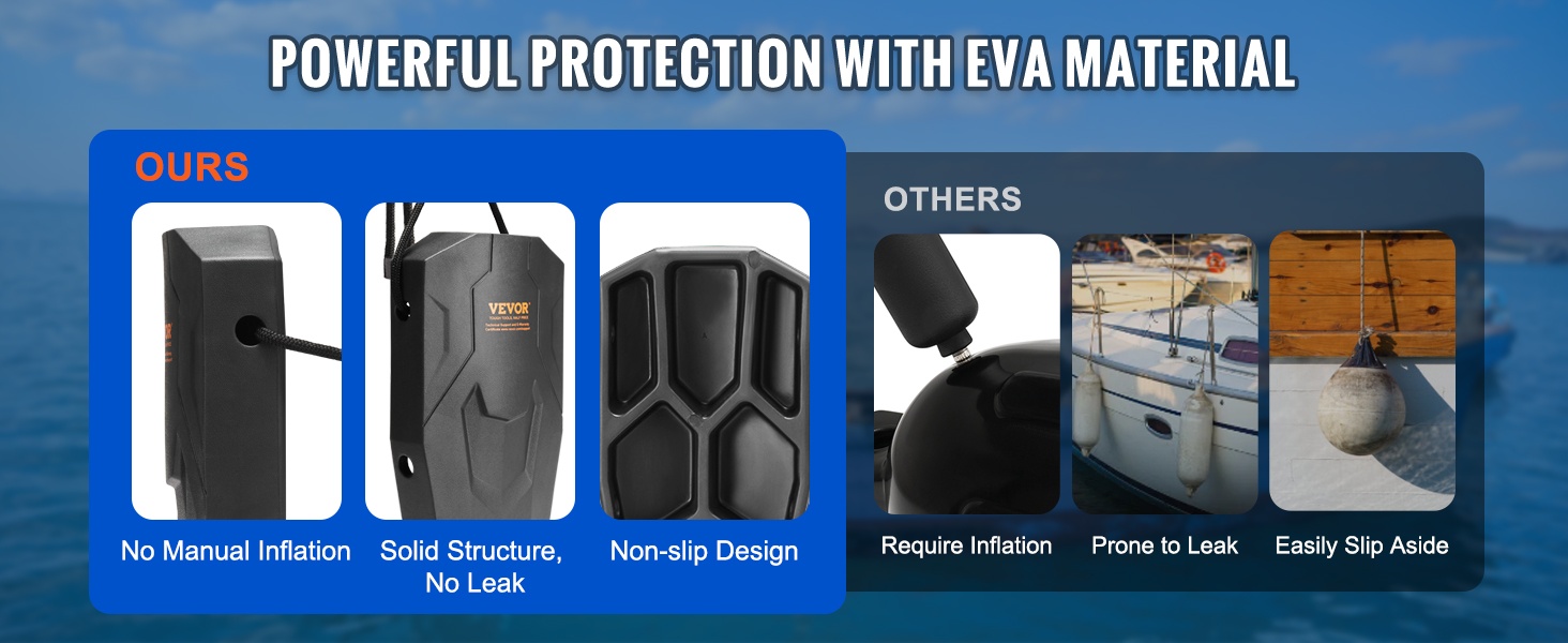 Puskurit on valmistettu laadukkaasta EVA-materiaalista, joka tarjoaa korkean tiheyden ja hyvän kimmoisuuden. Materiaali kestää UV-säteilyä ja suojaa venettä pitkään. Ilmattomaksi suunniteltu rakenne poistaa vuotoriskin, ja moniruudukko-taustapuoli auttaa pitämään puskurin paremmin paikallaan.