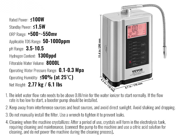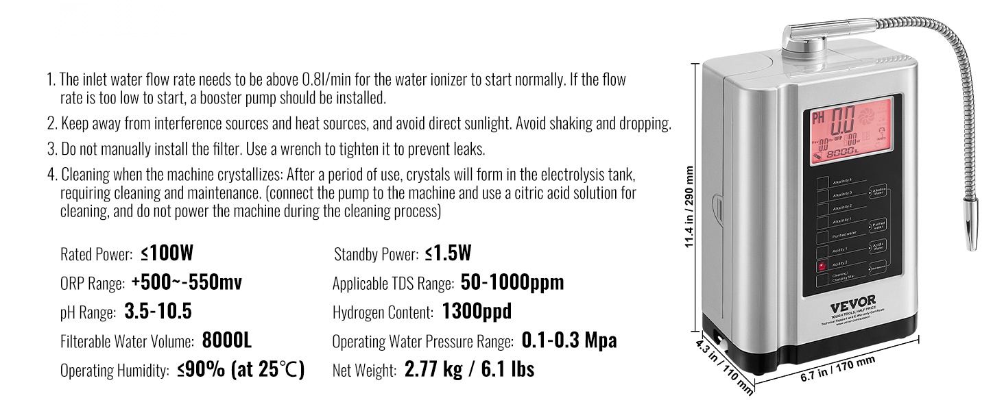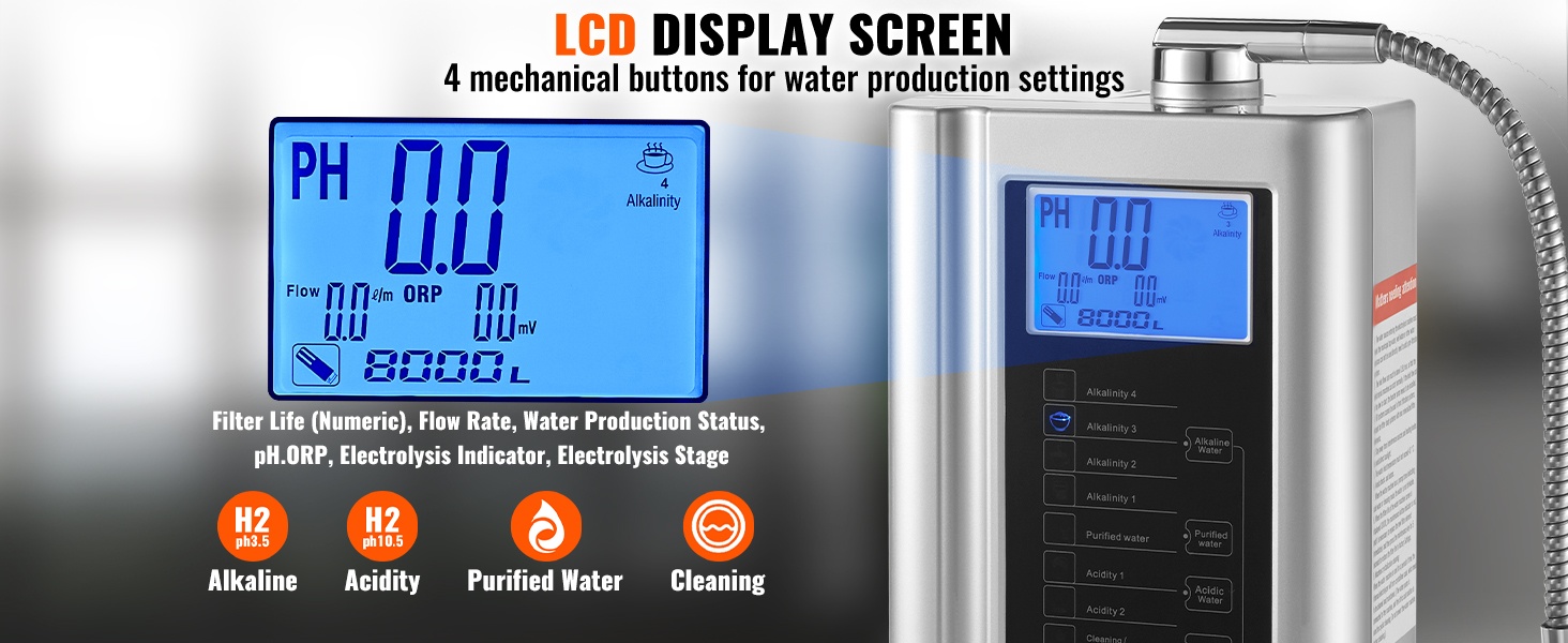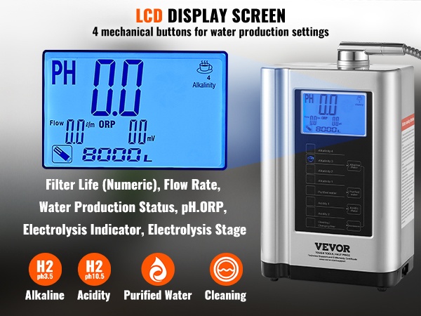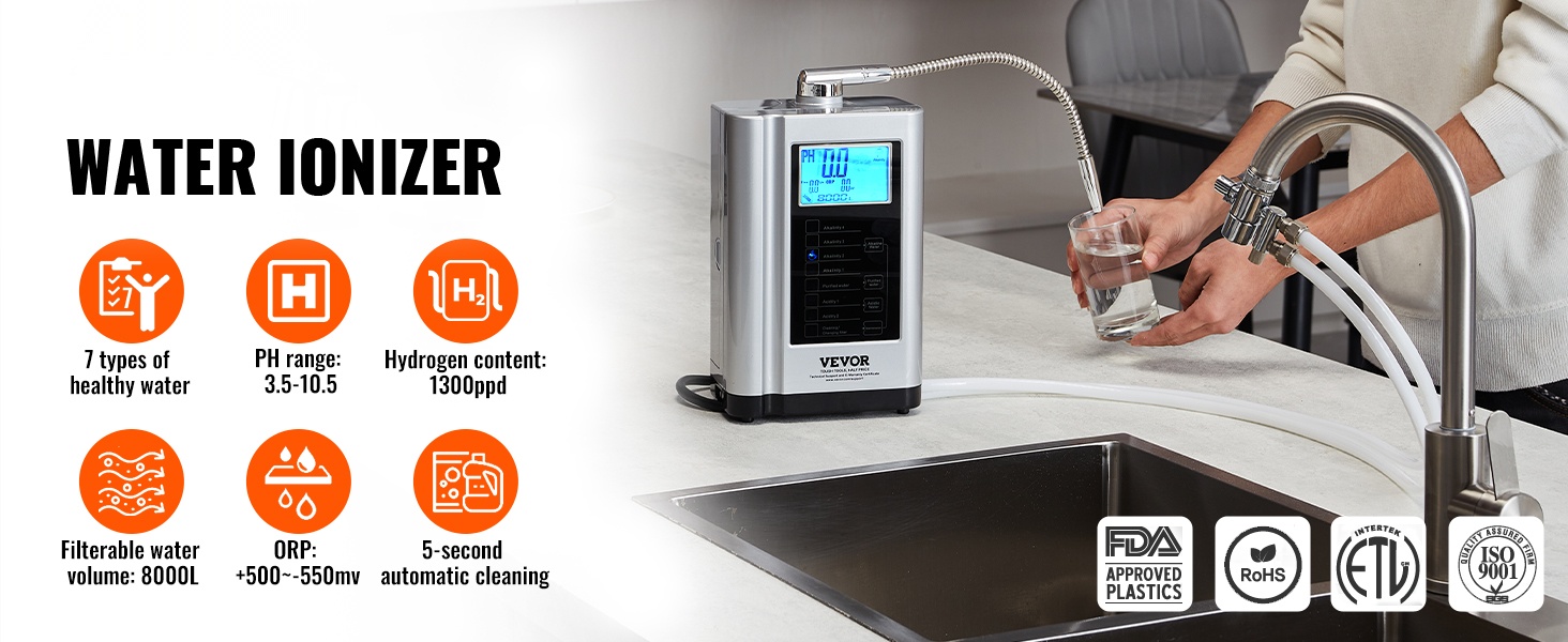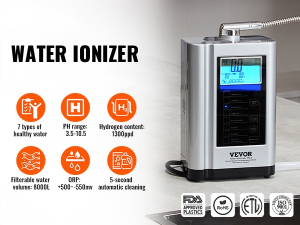 Laite pystyy tuottamaan erilaisia terveellisiä vesityyppejä, kuten emäksistä vettä, puhdistettua vettä ja hapanta vettä. Kotikäyttöön tarkoitettu suodatusjärjestelmä muuttaa tavallisen hanaveden elektrolysoiduksi vedeksi, mikä voi auttaa tasapainottamaan kehon pH-tasapainoa, tukemaan jaksamista sekä täydentämään tärkeitä mineraaleja ja elektrolyyttejä.