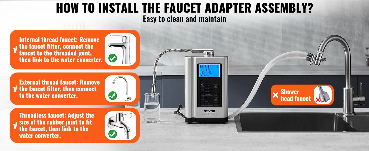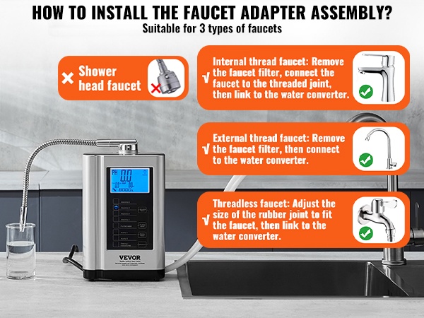 Vesionisaattori toimitetaan hanasovittimen kanssa, joten se sopii kolmeen hanatyyppiin: sisäkierteisiin hanoihin, ulkokierteisiin hanoihin ja kierteettömiin hanoihin.