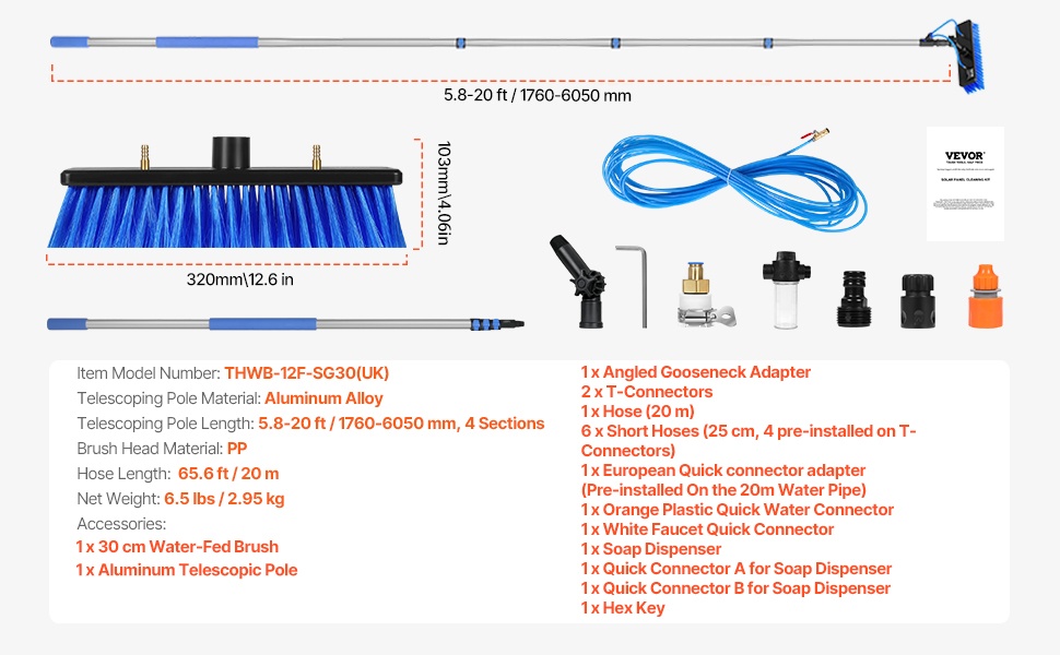 Teleskooppivarsi alumiiniseos 1785–7345 mm 180° kääntyvä harjapää 2 vesisuutinta 20 m letku