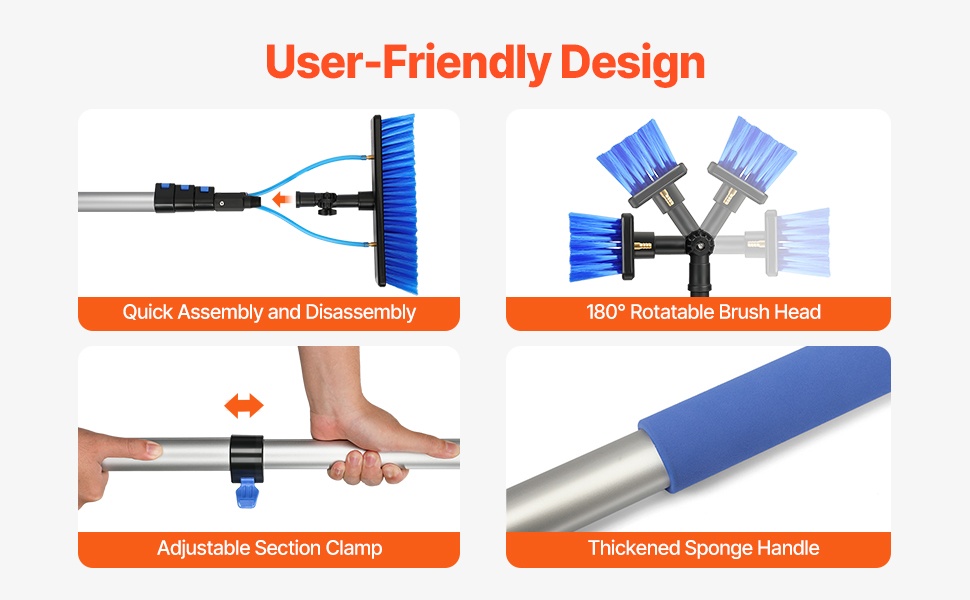Huolellisesti suunniteltu rakenne mahdollistaa nopean kokoamisen ja purkamisen. 180° kääntyvä ja 11.8-tuumainen harjapää kattaa suuren alan yhdellä vedolla, ja paksunnettu sieniote parantaa otetta ja vähentää käsien rasitusta pidemmissäkin työrupeamissa.