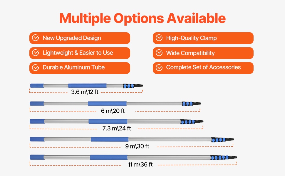 - Teleskooppivarsi: pituus 7–36 ft / 2150–11000 mm, 6 osaa