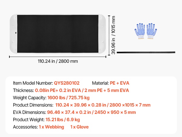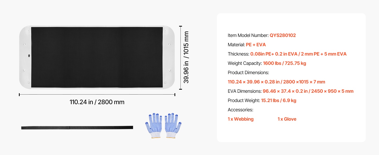 - Tuotteen mitat: 110.24 × 39.96 × 0.28 tuumaa / 2800 × 1015 × 7 mm