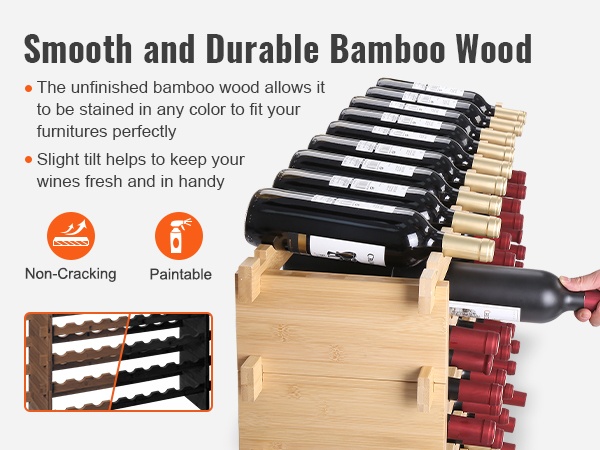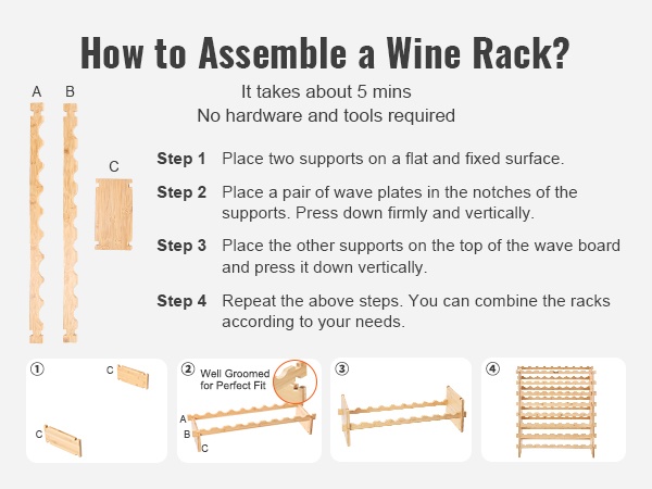 Bambusta valmistetun viinitelineen kokoaminen on nopeaa ja yksinkertaista. Asennus vie noin 5 minuuttia, eikä työkaluja tai erillisiä kiinnitystarvikkeita tarvita. Tasoja voi pinota niin monta kuin tilaan ja käyttöön sopii.