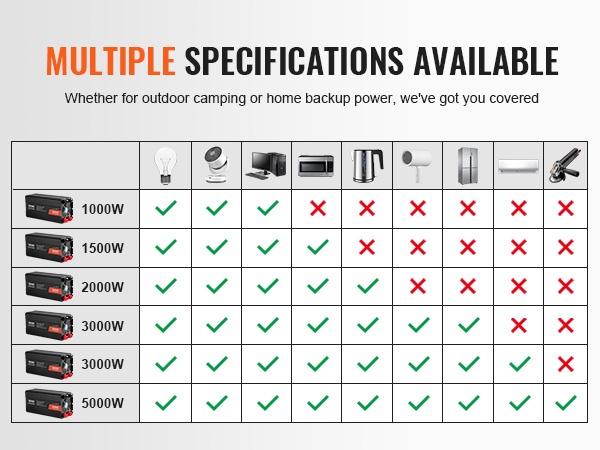 Sarjaan kuuluu eri teholuokkia: 1000W, 1500W, 2000W, 3000W ja 5000W sekä muokatun siniaallon ja puhtaan siniaallon vaihtoehdot. Näin on helppo valita ratkaisu sekä pienille laitteille että suuremmille kodinkoneille.