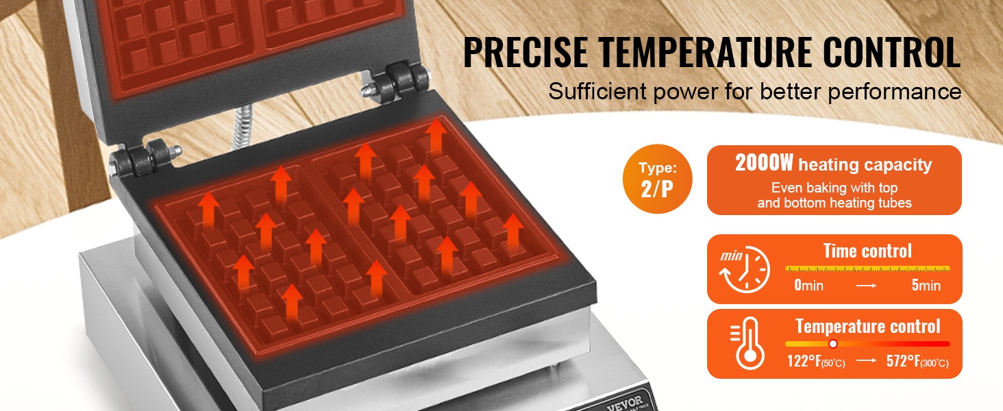 Vohvelirauta on varustettu selkeästi merkityillä ajastin- ja lämpötilasäätimillä. Kun vohvelit ovat valmiit, laite antaa äänimerkin. Suljetun lämmityskierron ansiosta molemmat puolet kuumenevat tasaisesti, muotoilu onnistuu nopeasti ja saat tasalaatuisia vohveleita kerta toisensa jälkeen.