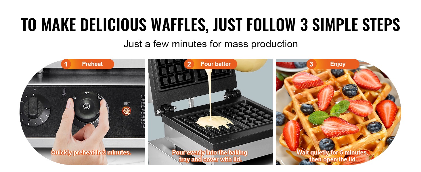 Valmista taikina reseptisi mukaan, kaada se esilämmitetylle paistolevylle, sulje kansi ja odota äänimerkkiä. Voit paistaa useita vohveleita lyhyessä ajassa, mikä tekee aamiaisesta ja välipaloista sujuvia sekä kotona että ammattilaiskäytössä.