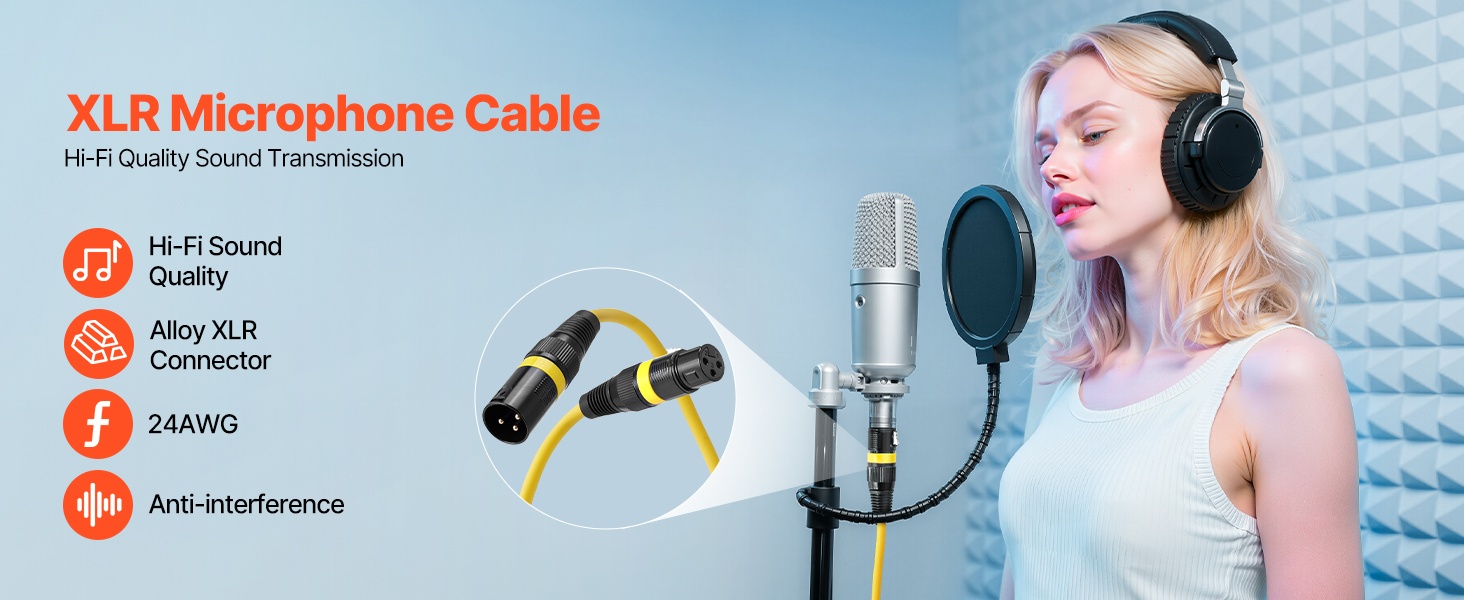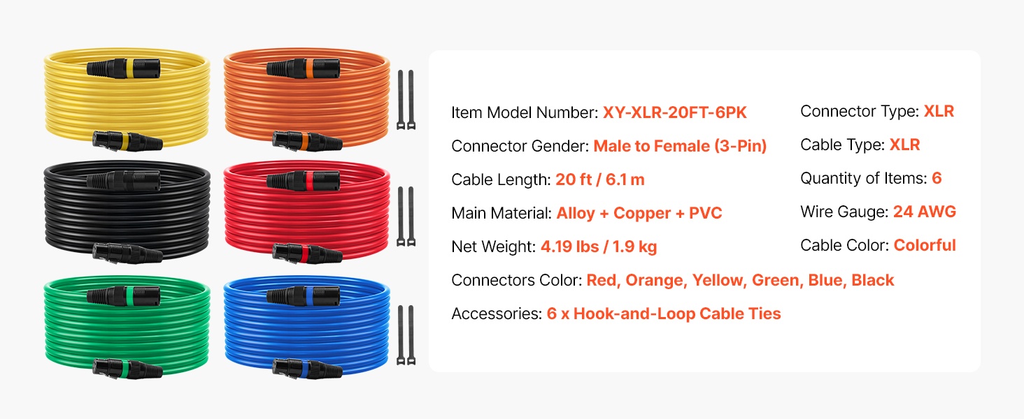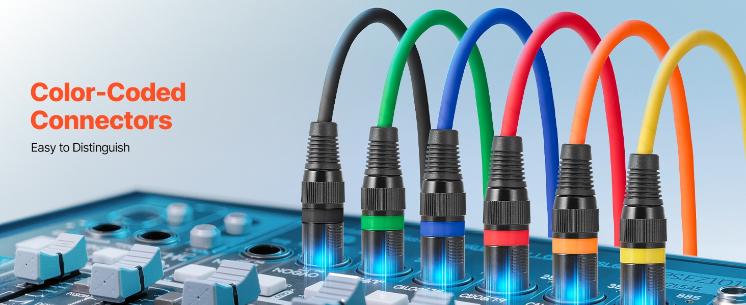 7.62 m XLR-mikrofonikaapelisetti, jossa on 6 kappaletta tasapainotettuja ja suojattuja DMX-kaapeleita. Sopii esimerkiksi lavavalaistukseen, mikrofoneille, vahvistimille, mikserille ja kaiutinjärjestelmille. Kaapeleissa on kultapinnoitetut 3-napaiset XLR-liittimet ja värikoodatut päät, jotka helpottavat kytkentöjen hallintaa.