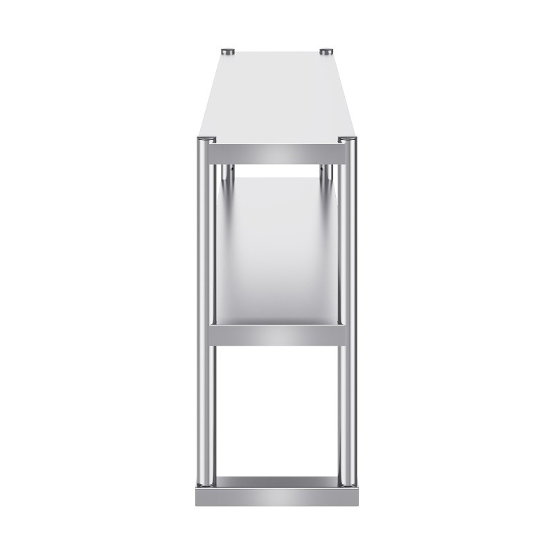 Kaksitasoinen ruostumattomasta teräksestä valmistettu ylähylly tarjoaa käytännöllistä lisätilaa työpöydän tai valmistelupöydän yläpuolelle. Se sopii hyvin keittiöihin, ravintoloihin, pajoihin ja muihin tiloihin, joissa tarvitaan kestävää ja helposti puhdistettavaa lisäsäilytystä.